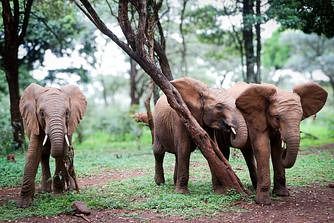 Galla (left) tries to push down a tree. Ndiwa (right) pushes just as hard on the other side.